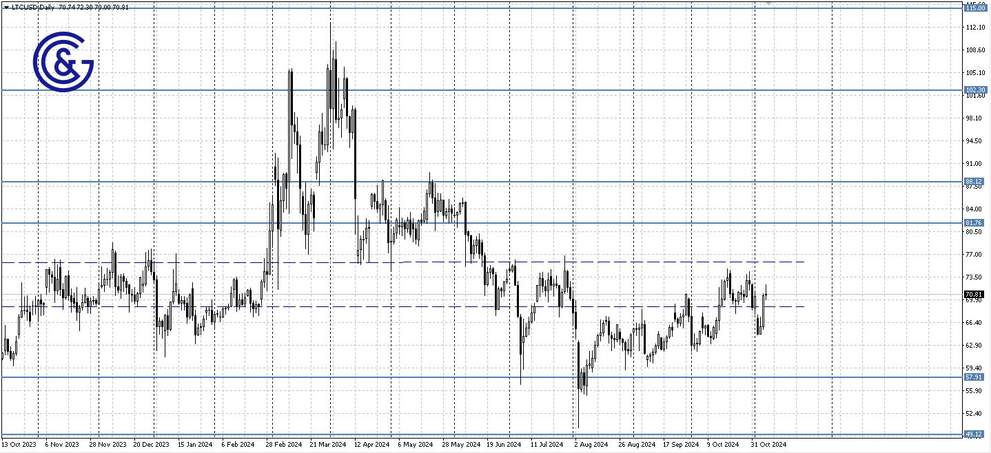 After a brief dip, Litecoin has returned to the narrow range between 68.80 and 76.95, bounded by two dotted lines. The price now has some room to move towards its resistance. If it exits the range upwards with continued market growth, it could pave the way for LTC/USD to reach the next target of 81.76.