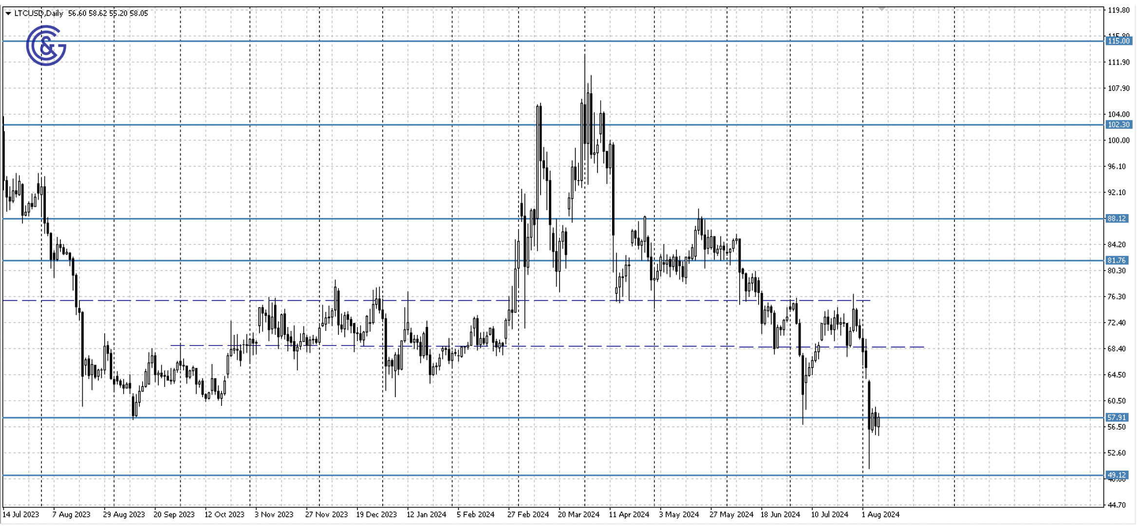 Litecoin is currently trading below 57.91, and it might continue to fall to 49.12. However, if the breakout of the 57.91 level turns out to be false, LTC/USD could bounce back to the resistance level at 68.80 marked with dotted lines.