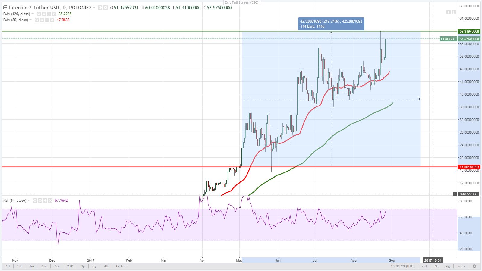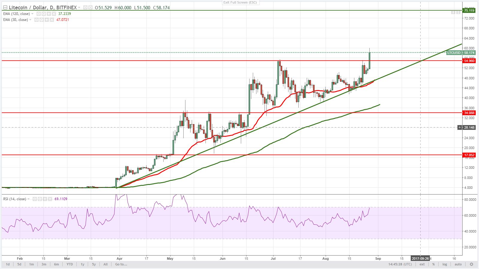 В ходе торгов, 27 августа котировки LTC показали уверенный рост. Litecoin достиг отметки $60,00 за монету, преодолев предыдущий исторический максимум, $55,471, который был достигнут 5 июня 2017 года.