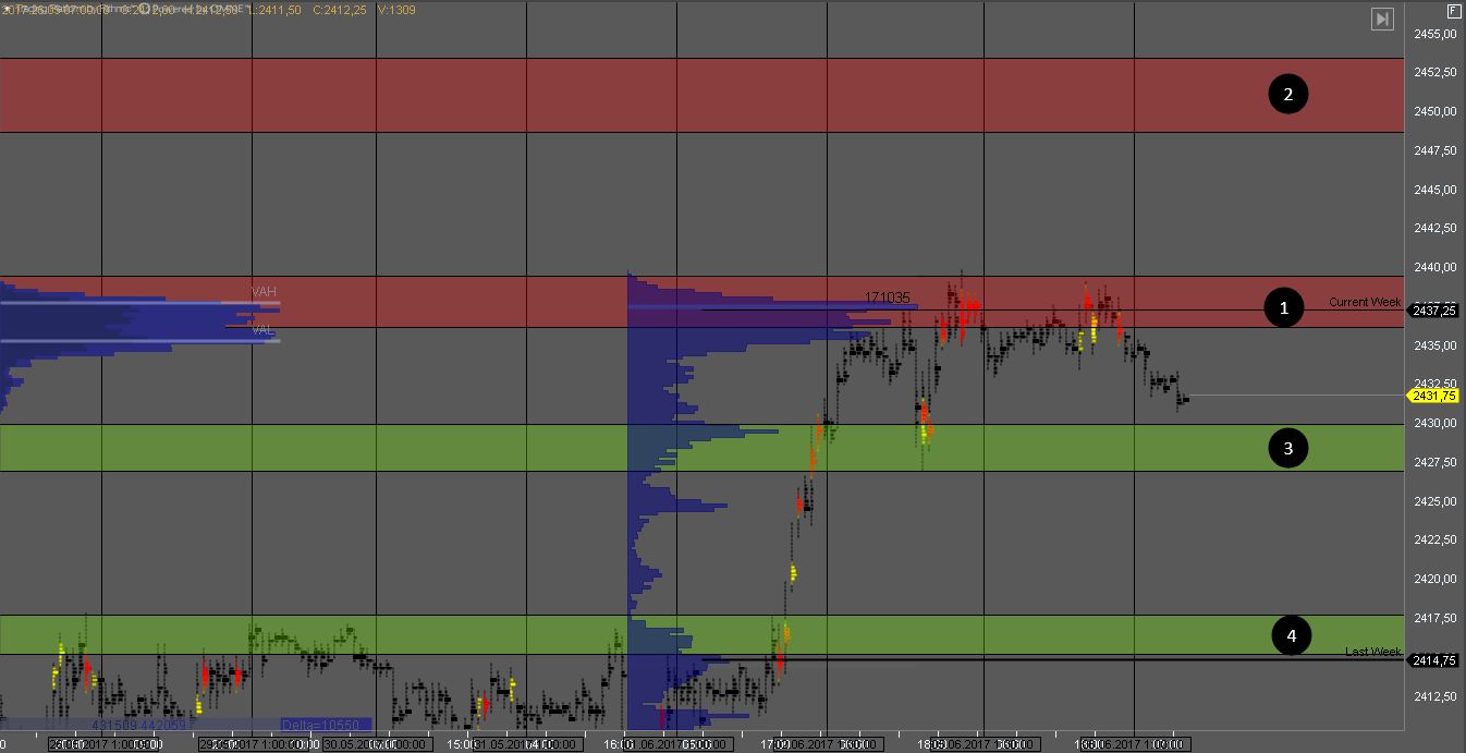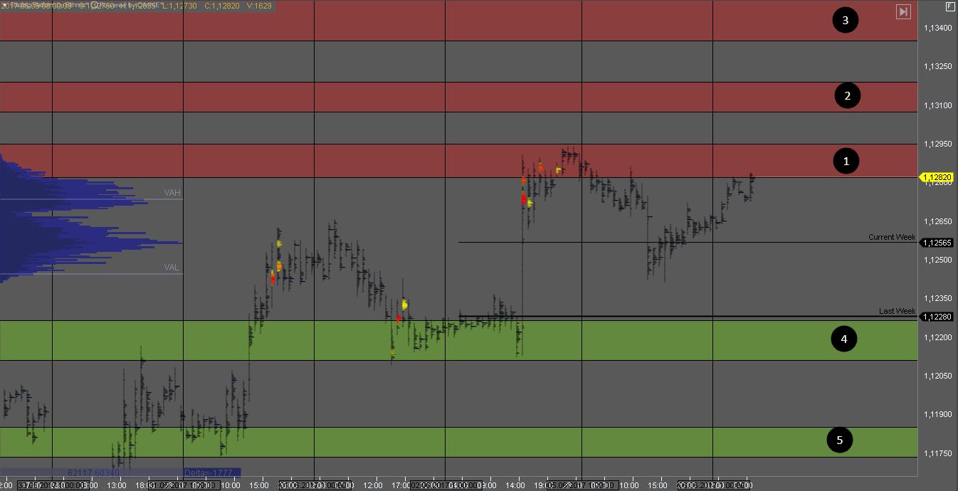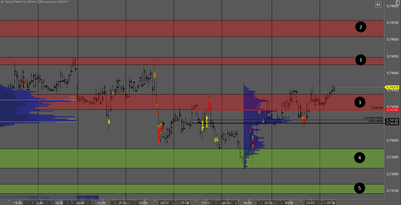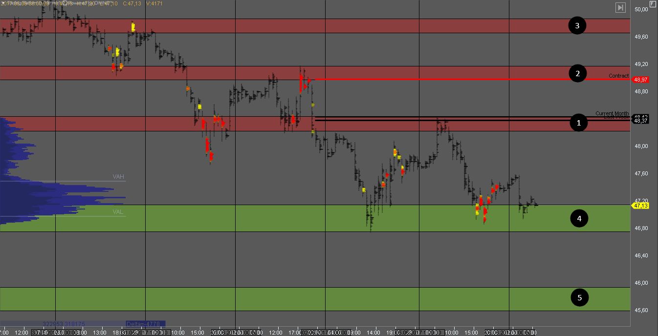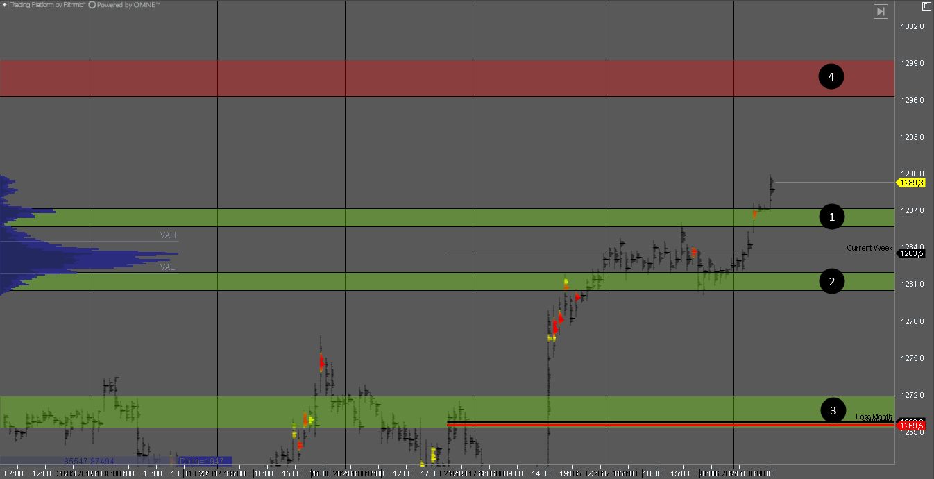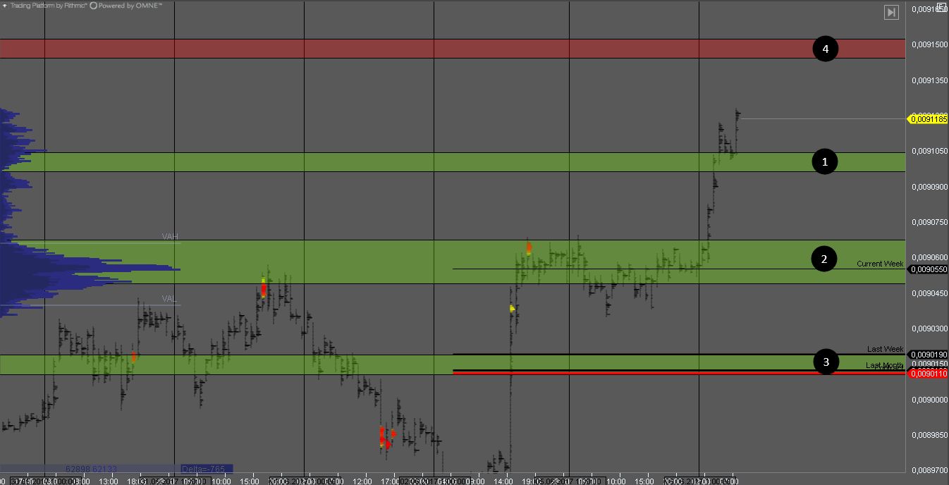 Если покупатели преодолеют зону объема прошлого месяца 1 и закрепятся выше зоны 4, внутри дня можно будет искать возможности для покупки с целью в зоне 2 и 3.