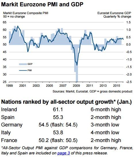 Тем временем Европейский индекс деловой активности начал год чуть лучше прогнозов. Повторная оценка показала, что сводный индекс менеджеров по закупкам PMI производственного сектора и сферы услуг стран евро зоны, в январе поднялся на 0,1 пункта – до 53.6. Однако это по-прежнему почти на пункт ниже уровня декабря.