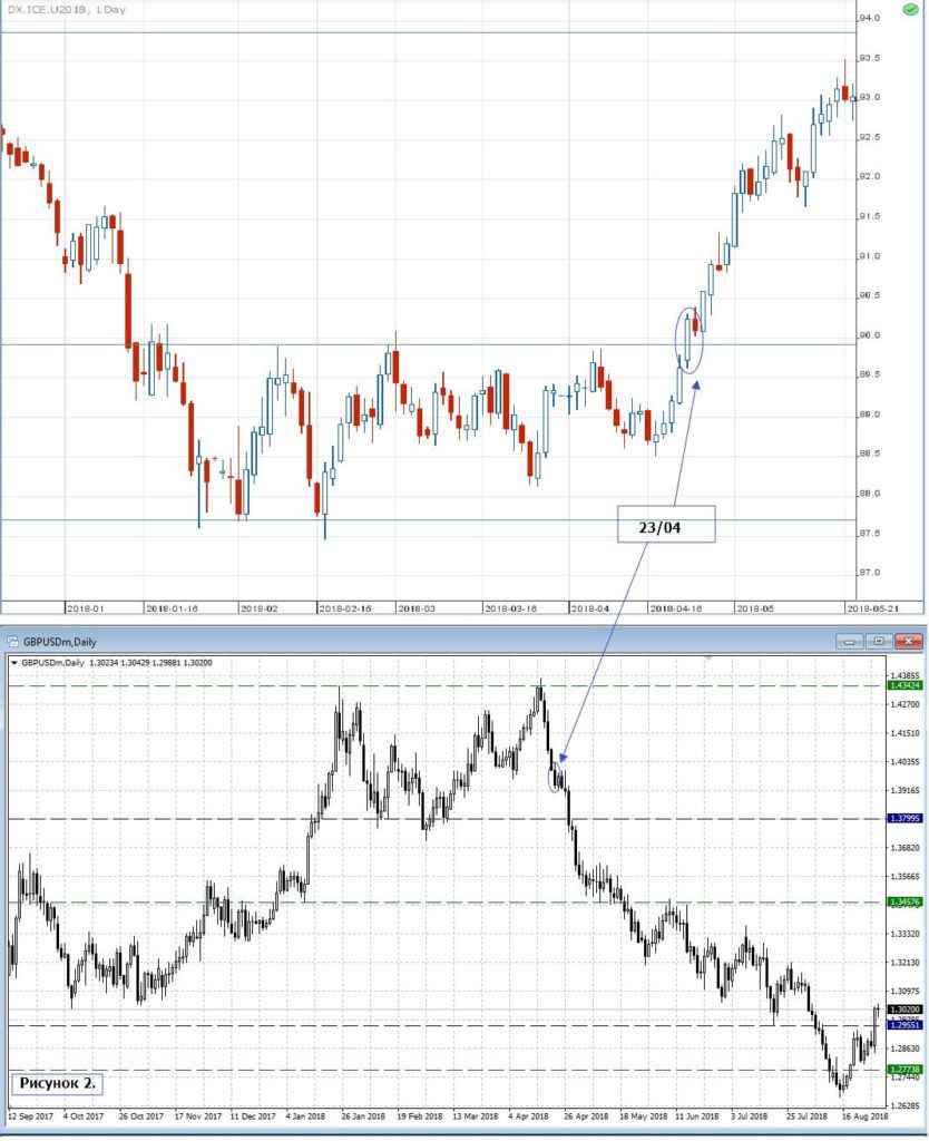 Посмотрим на индекс доллара как на корзину валют с приоритетным в нём евро (57,6 %). Индекс доллара простаивал с конца января 2018 года по середину апреля. 23.04.18 индекс доллара пробивает и выходит выше границ диапазона, и это сильный корреляционный сигнал, что высока вероятность смены технического фона по доллару на укрепление, и, значит, вполне будет реакция по большинству валют.