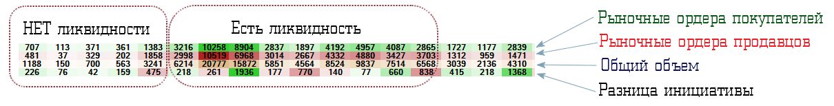 • с количеством инициативных покупок, продаж, разницей инициативы и общим количеством объема: