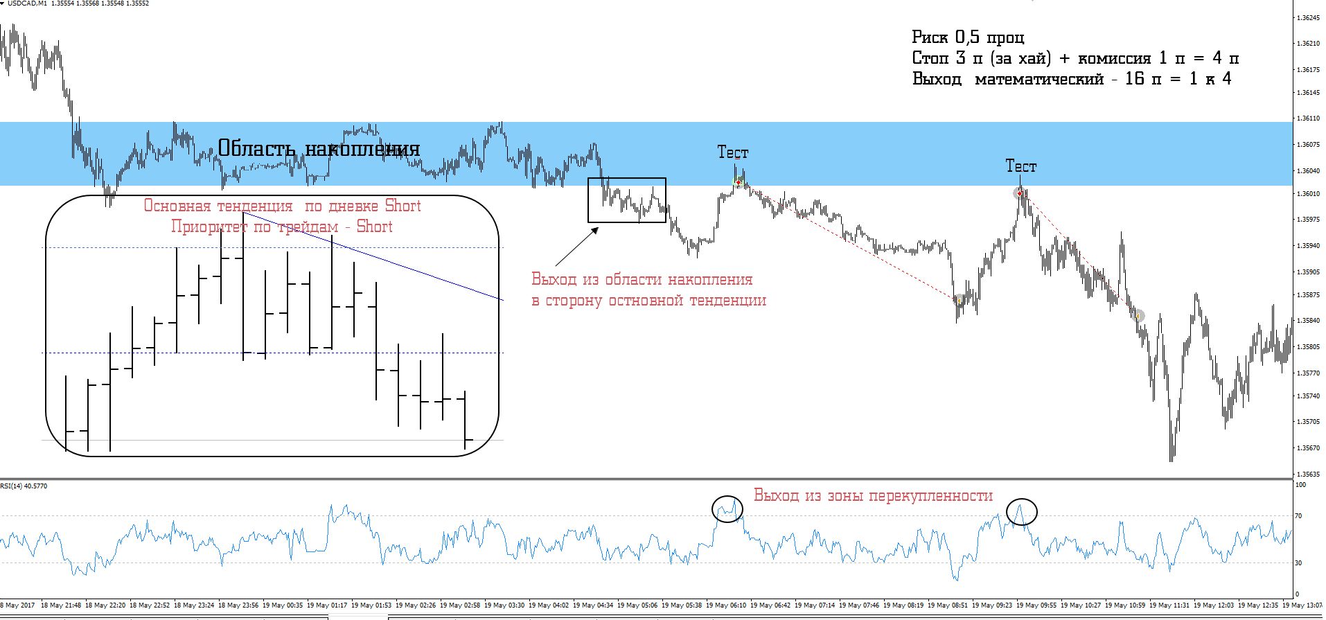 Именно такой пример скальперской сделки мы сейчас и рассмотрим. Стратегия выбрана на основе зон накопления и RSI:
