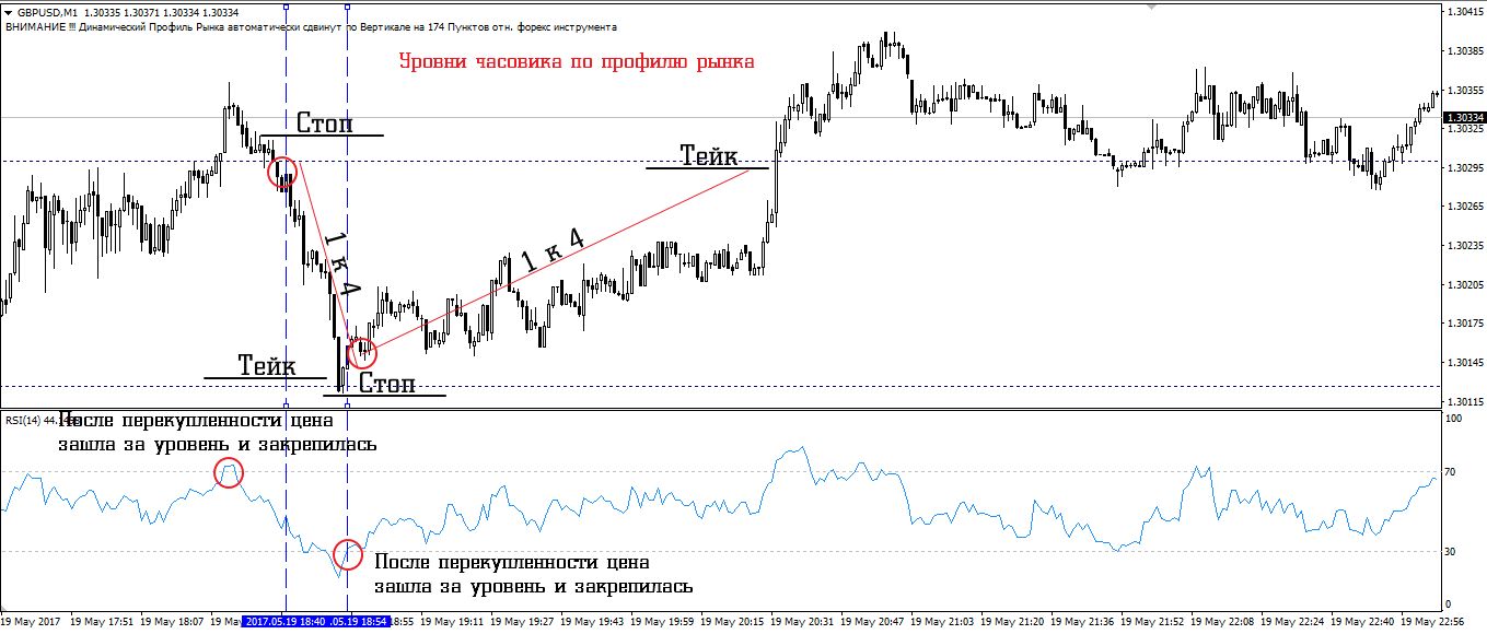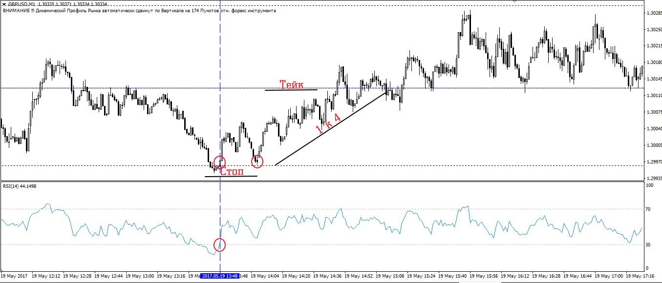 Для примера взят примитивный алгоритм. Цена под уровнем – RSI выходит из перекупленности. Цена над уровнем – индикатор выходит из перепроданности. Стал за экстремум. Тейк 1 к 4.